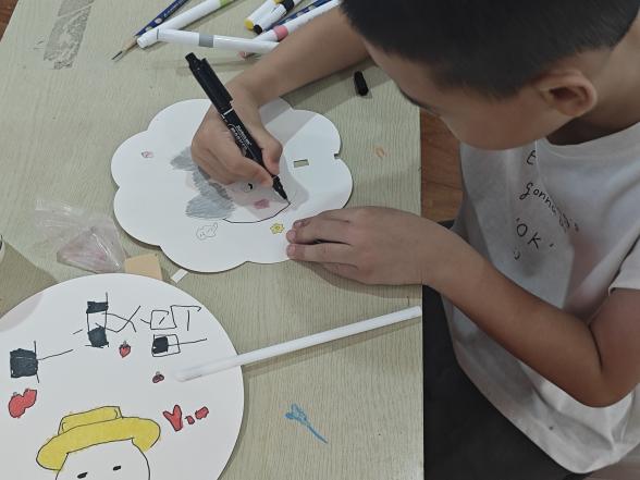 8月6日活动室变身传统艺术工坊。志愿者以趣味互动的方式,带领孩子们穿越时空,探寻明朝纹样的美学密码。云纹的飘逸、龙纹的威严、凤纹的华美,都在孩子们惊喜的眼神中变得鲜活起来。创作环节中,小艺术家们挥动画笔,将传统纹样与现代创意完美融合。老师们的悉心指导,同伴间的灵感碰撞,让每把团扇都成为独一无二的艺术品。