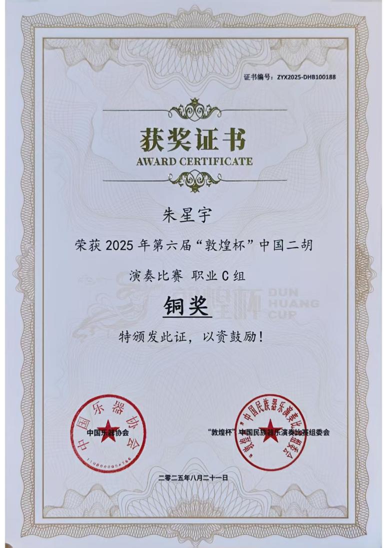 (通讯员 朱星宇)“敦煌杯”比赛与展演系列活动自2010年举办首届全国二胡大赛以来,始终秉持“弘扬国乐精神、培育艺术人才、推动文化传承”的初衷,以专业、严谨、创新的态度深耕民族音乐领域。第六届“敦煌杯”由中国二胡演奏比赛中国乐器协会、“敦煌杯”中国民族器乐比赛组委会联合主办。宋飞出任评委会主席,王建民、邓建栋、朱昌耀、周维、胡志平出任评委会副主席。本次比赛选手演奏水平高,竞争十分激烈,通过初赛、复赛、决赛三轮线上及线下激烈角逐,公司2024级研究生朱星宇荣获“敦煌杯”中国二胡演奏比赛铜奖,指导老师陈赛君副教授。