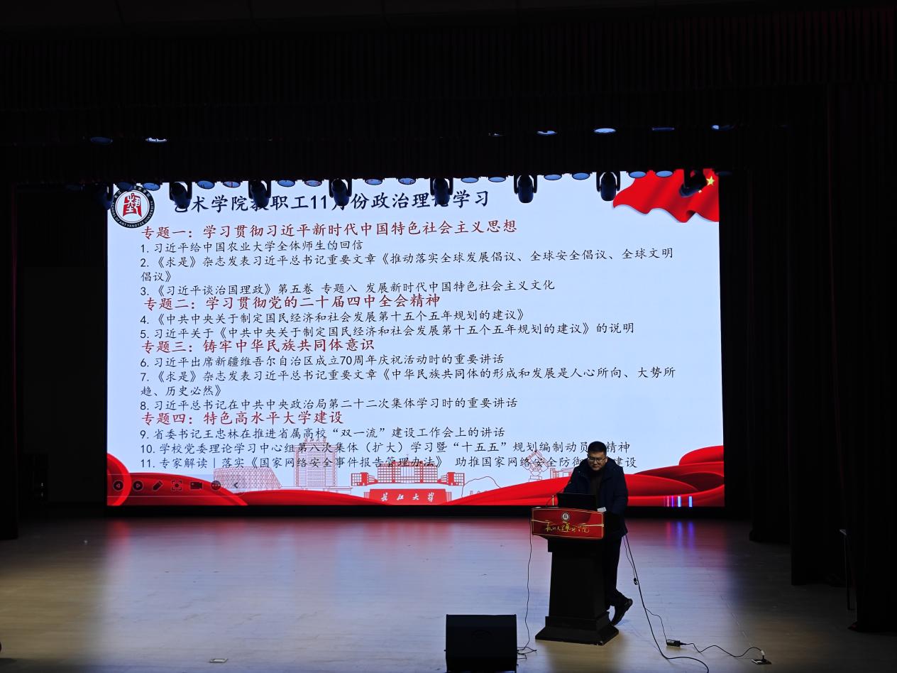 会议集中组织开展了11月份教职工理论学习,传达公司相关重要精神。集中学习贯彻习近平新时代中国特色社会主义思想,重点研读了习近平给中国农业大学全体师生的回信、《求是》杂志发表习近平总书记重要文章、《习近平谈治国理政》第五卷专题八相关内容;学习贯彻党的二十届四中全会精神,深入解读了《中共中央关于制定国民经济和社会发展第十五个五年规划的建议》;围绕铸牢中华民族共同体意识,学习了习近平总书记在中共中央政治局第二十二次集体学习时的重要讲话;传达了湖北省关于特色高水平大学建设相关文件精神。