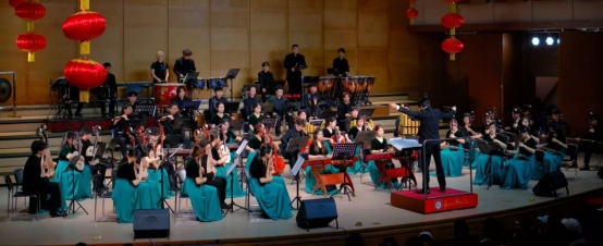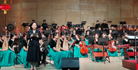 导聆铺垫完毕,“主角”登场。指挥赵宏斌副教授轻抬双手,乐团应声而动,挥洒间,《春天组曲》如溪水破冰,明快灵动;《西部民歌联奏》似大漠孤烟,辽阔苍茫;《印象国乐》若水墨晕染,意境深远;压轴曲目《花好月圆》更是将气氛推向高潮,喜庆欢快的旋律让在场师生情不自禁打起节拍。四种风格,四幅画卷,民族乐器的丰富表现力在音乐厅内流转回荡,掌声经久不息。