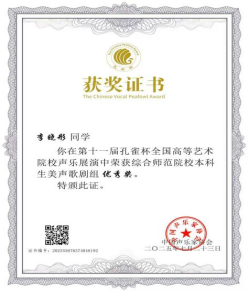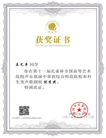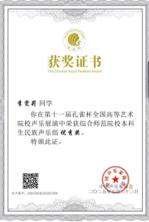 在第十一届孔雀杯全国高等艺术院校声乐展演中荣获综合师范院校本科生民族声乐组优秀奖。这次经历是我老员工涯中浓墨重彩的一笔。它让我深刻体会到团队支持的力量和个人坚持的重要性。从备战到站上舞台,每一个环节都是成长。这份荣誉属于集体,属于每一位给予我帮助的人。我将珍藏这份鼓励,将其化为前进的动力,在未来的艺术追求中继续保持热爱,坚守初心,勇攀高峰。